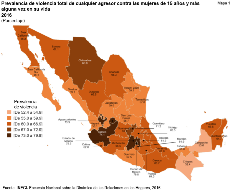 Los resultados de la Endireh 2016 permiten determinar la prevalencia de la violencia entre las mujeres de 15 años y más. A partir de  esta información es posible afirmar que la violencia contra las mujeres es un problema de gran dimensión y una práctica social ampliamente extendida en todo el país, puesto que 66 de cada 100 mujeres de 15 años y más (30.7 mil) residentes en el país, han experimentado al menos un acto de violencia de cualquier tipo, ya sea violencia emocional, física, sexual, económica, patrimonial o discriminación laboral, misma que ha sido ejercida por diferentes agresores, sea la pareja, el esposo o novio, algún familiar, compañero de escuela o del trabajo, alguna autoridad escolar o laboral o bien por amigos, vecinos o personas conocidas o extrañas.