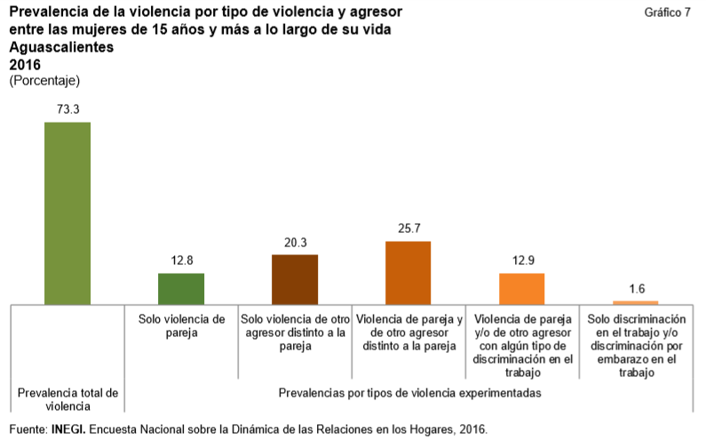 Para ello se agruparon en tres grandes categorías: violencia de pareja, de otros agresores (violencia en la escuela, trabajo, comunitaria, familia) y discriminación en el trabajo. Lo que permite señalar que, si bien en general 73 de cada 100 mujeres en Aguascalientes fueron víctimas al menos una vez de cualquier tipo de violencia, incluyendo la discriminación; al combinar las dimensiones que lo integran, se aprecia que el 34.7% de ellas ha recibido agresiones solo de la pareja (12.8%), o bien solo de otro agresor (20.3%), o solo fue discriminada en el trabajo (1.6 por ciento). El restante 38.6% ha sido violentada por distintos agresores, incluyendo a su pareja o ex-pareja.