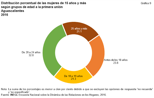 En Aguascalientes, el 23.8% de las mujeres de 15 años y más se casó o unió por primera vez antes de los 18 años, y antes de cumplir 20 años, poco menos de la mitad ya estaba cohabitando con una pareja. Y antes de cumplir 25 años, el 77.9% ya estaba casada o unida por primera vez.