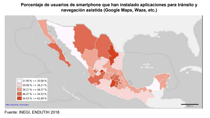 La Encuesta Nacional sobre Disponibilidad y Uso de Tecnologías de la Información en los Hogares (ENDUTIH) revela que en México hay 74.3 millones de usuarios de Internet y 18.3 millones de hogares con conexión a este servicio. El 92.7% de los usuarios se conectan a Internet a través de un teléfono inteligente y de ellos, el 48.2% declaró que ha instalado una aplicación para tránsito y navegación asistida.