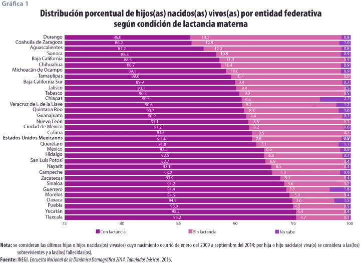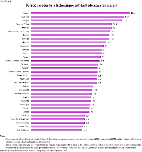Por entidad federativa, Tlaxcala, Yucatán y Puebla son los que reportan los porcentajes más altos de lactancia materna; en contraste, Aguascalientes, Coahuila de Zaragoza y Durango tienen los más bajos. En cuanto a duración tenemos que: Chihuahua, Coahuila de Zaragoza, Aguascalientes (6.9 meses), Nuevo León (6.7) y Baja California (6.6) son las entidades con la duración promedio más baja