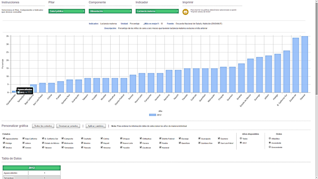 La Ensanut detectó que en Aguascalientes el porcentaje de los niños(as) de cero a seis meses, que tuvieron lactancia materna exclusiva el día anterior, fue del 1%. Los Objetivos de Desarrollo Sostenible (ODS 2) la contemplan como una herramienta para poner fin al hambre, lograr la seguridad alimentaria y mejorar la nutrición.