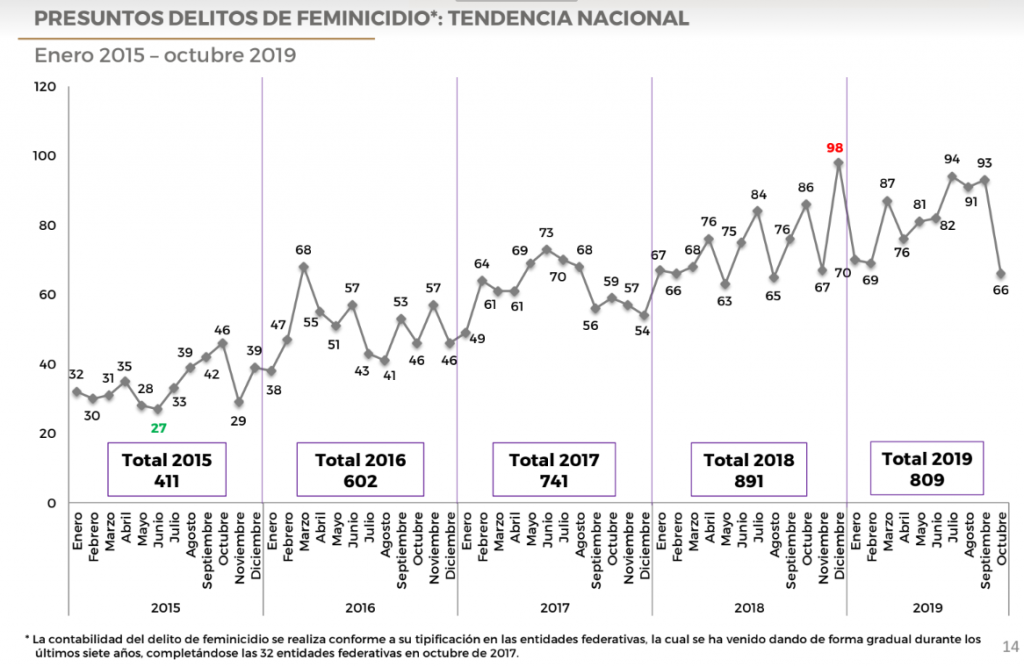 En lo que va del año 93,760 víctimas mujeres de los siguientes delitos: homicidio (doloso y culposo); feminicidio; secuestro; extorsión; lesiones (dolosas y culposas); rapto; tráfico de menores; trata de personas; corrupción de menores; así como otros delitos que atentan contra la vida y la integridad corporal; otros delitos que atentan contra la libertad personal; y otros delitos contra la sociedad. En los diez meses de 2019, se han registrado 809 presuntos feminicidios. El municipio de Aguascalientes ocupa el sitio 43 entre los cien municipios con incidencia de presuntos feminicidios.