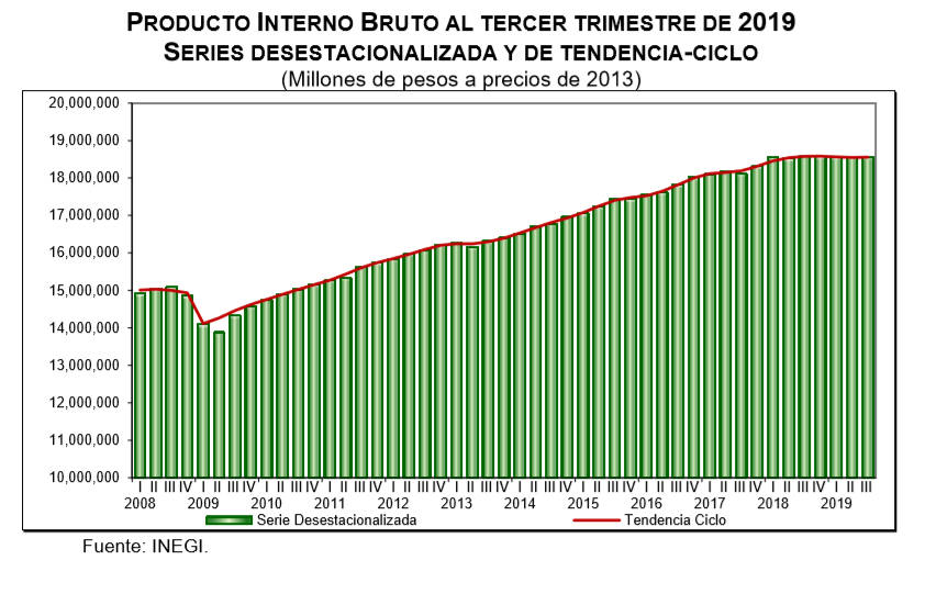 - El Inegi presentó los resultados del Producto Interno Bruto (PIB), los cuales indican que éste no reportó variación en términos reales durante el tercer trimestre de 2019 respecto al precedente, con cifras ajustadas por estacionalidad.