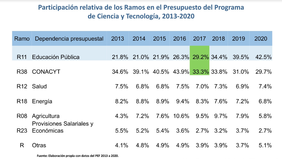 Pese a que Conacyt es la cabeza de sector recibe menor presupuesto que otras áreas, pues en los últimos ocho años éste es su presupuesto más bajo. El más alto lo alcanzó en el año 2016 cuando se le otorgó el 43.9 por ciento.