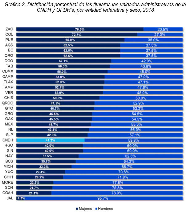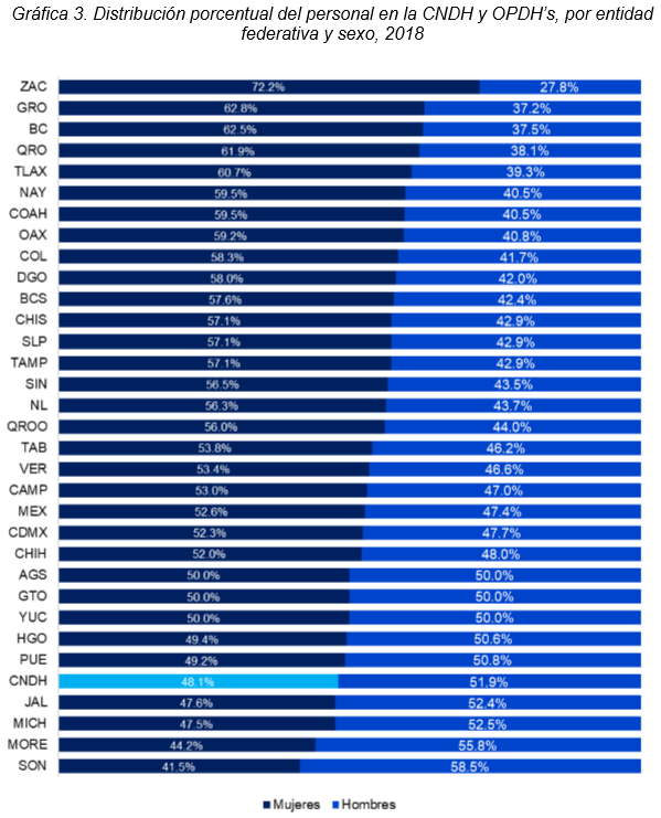 Al cierre de 2018, había 5 mil 759 servidores públicos adscritos a las unidades administrativas, de los cuales, 45.8% del personal en los OPDH fueron hombres y 54.2% mujeres. En la CNDH los hombres representaron 51.9% y las mujeres 48.1%. De acuerdo con la siguiente distribución, Zacatecas fue la entidad con el mayor porcentaje de mujeres con 72.2%.