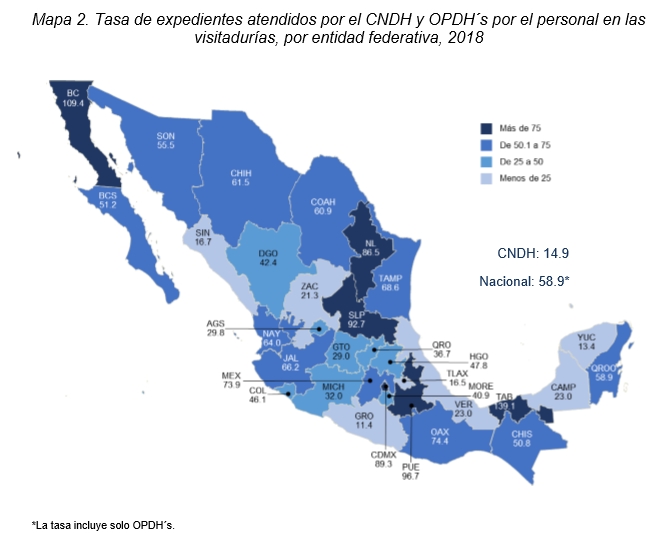 Entre la información que se puede consultar es posible conocer las características de la estructura organizacional y recursos con los que contaron la Comisión y los OPDH. De esta manera destaca que al cierre del 2018 se tuvo registro de 633 unidades administrativas (17 en la CNDH y 616 en OPDH), siendo la mayoría visitadurías generales o subprocuradurías (15.5%).