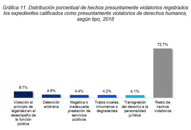 El presunto hecho violatorio más frecuente fue Violación al principio de legalidad en el desempeño de la función pública, que correspondió a 9.7% del total de hechos registrados a nivel nacional.