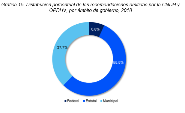 Finalmente, la CNDH y los OPDH emitieron un total de mil 814 recomendaciones a las instituciones públicas de los diferentes ámbitos de gobierno (87.7% correspondieron a OPDH y 12.3% a la CNDH). Del total, 55.5% se emitió para autoridades del ámbito estatal, 37.7% para las correspondientes del ámbito municipal y el restante 6.8% para el orden de gobierno federal.