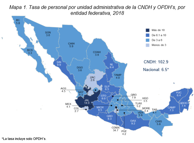 De acuerdo con la tasa de servidores públicos por unidad administrativa en las entidades federativas, en la Ciudad de México se registró la tasa más alta con 34.7. Por lo que respecta a la CNDH, la tasa fue de 102.9. En Aguascalientes la tasa fue de 4.5.