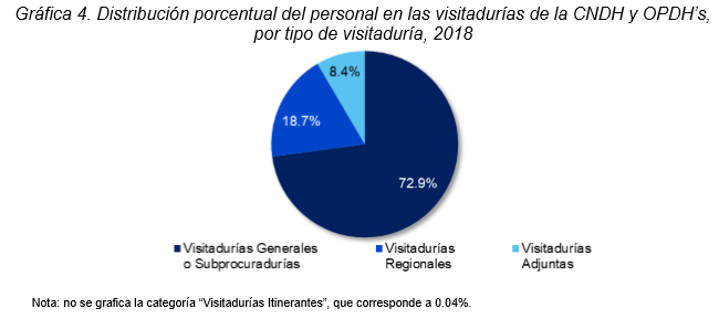 Del total de servidores públicos en la CNDH y OPDH, 41.8% estuvo adscrito a visitadurías, la mayoría en las generales o subprocuradurías.