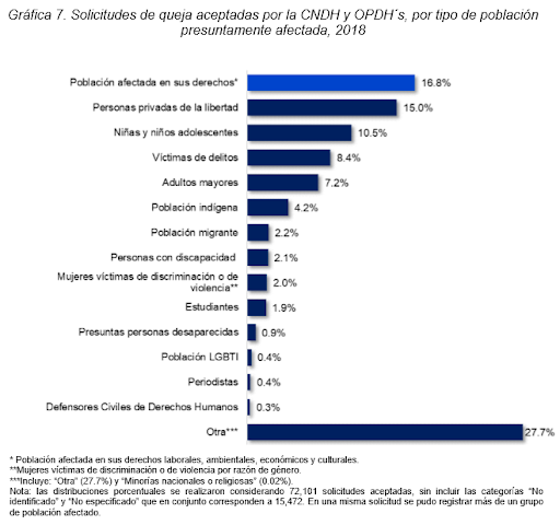 Por lo que respecta a las personas o grupos que presuntamente sufrieron alguna transgresión a sus derechos, en 16.8% de las solicitudes aceptadas se trató de “población afectada en sus derechos laborales, ambientales, económicos y culturales”, 15.0% correspondió a “personas privadas de la libertad” y, 10.5% a “niñas y niños adolescentes”.
