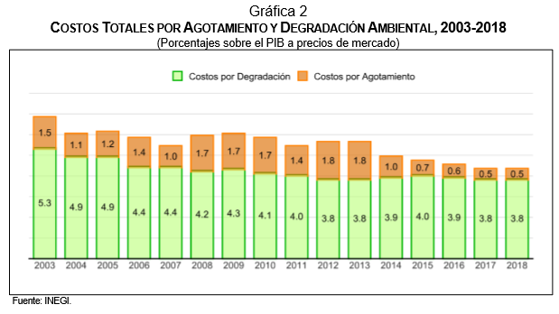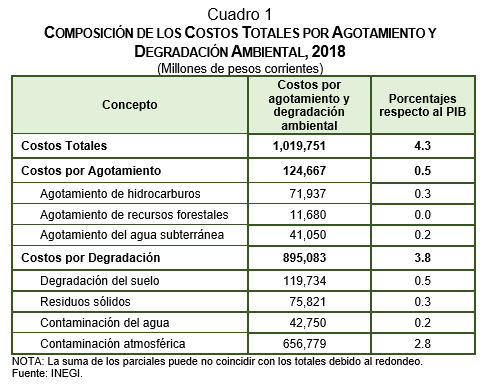 Durante el proceso productivo se generan costos ambientales derivados del agotamiento de los recursos naturales y de la degradación del medio ambiente. En 2018, estos costos registraron un monto de 1,019,751 millones de pesos, y representaron el equivalente al 4.3% del PIB a precios de mercado. Lo anterior refleja los gastos en los que tendría que incurrir la sociedad para prevenir o remediar la disminución y pérdida de recursos naturales, así como el deterioro del medio ambiente. Dichos costos se miden, por un lado, mediante balances físicos que permiten conocer la disponibilidad al inicio de un periodo (activos o acervos de apertura), sus cambios durante éste y lo que quedó de los recursos al final del periodo (activos o acervos de cierre). Por otro lado, cuando no es posible conocer el stock del recurso, o cuando el objetivo es medir las transferencias de contaminantes al medio ambiente, el registro se realiza a través de los flujos ocurridos a lo largo del periodo de estudio.