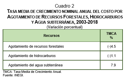 Por su parte, el costo por agotamiento de los hidrocarburos presentó una disminución promedio de (-)1.1% nominal, en igual periodo. En el 2018, el costo por el agotamiento de este recurso representó el 0.3% del PIB.