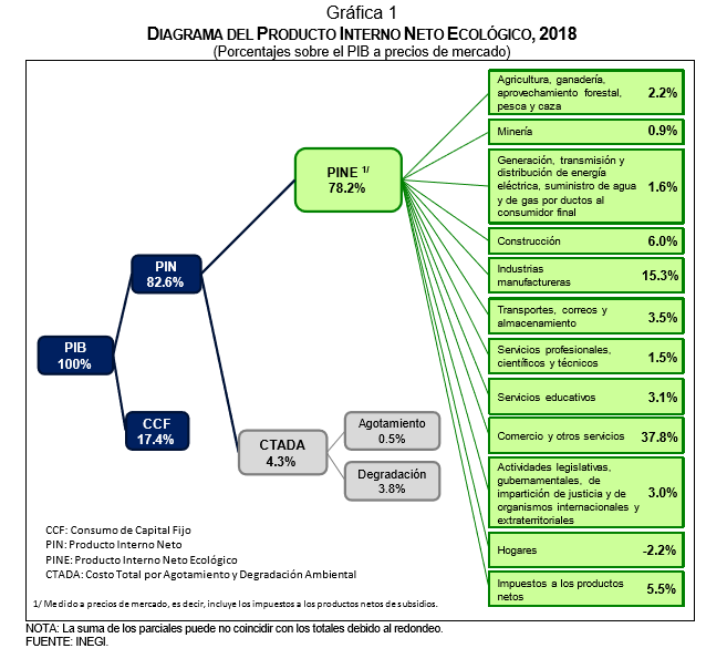El Producto Interno Neto Ajustado Ambientalmente o Producto Interno Neto Ecológico (PINE), en 2018, alcanzó un monto de 18,382,098 millones de pesos y representó el 78.2% del PIB, a precios de mercado, de ese año (véase gráfica siguiente). Los sectores que registraron el PINE más alto fueron el Comercio y otros servicios y las Industrias Manufactureras, con 37.8% y 15.3%, respectivamente.