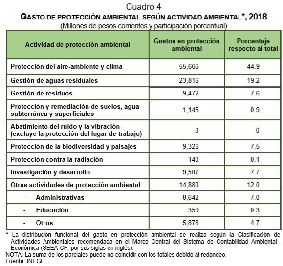 Los gastos en protección ambiental realizados por el sector público en su conjunto y por los hogares se situaron en 2018 en un nivel de 123,951 millones de pesos, que representó el 0.6% del PIB a precios básicos. De este total los principales gastos se ejercieron desde las Actividades legislativas, gubernamentales, de impartición de justicia y de organismos internacionales y extraterritoriales; la Generación, transmisión y distribución de energía eléctrica, suministro de agua y de gas por ductos al consumidor final; los Servicios profesionales, científicos y técnicos; la Minería, y los Transportes, correos y almacenamiento; reflejándose en actividades de administración de protección ambiental, captación y tratamiento de aguas residuales, protección de la biodiversidad e investigación y desarrollo. De esta manera, este conjunto de sectores destinó un monto de 119,459 millones de pesos, equivalente al 96.4% del total de los gastos en protección ambiental.