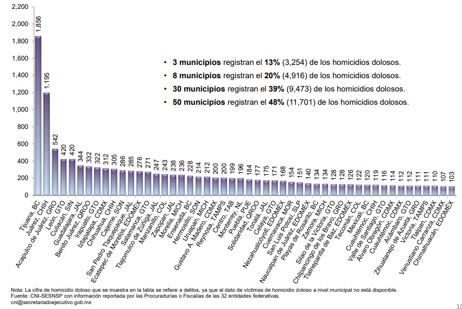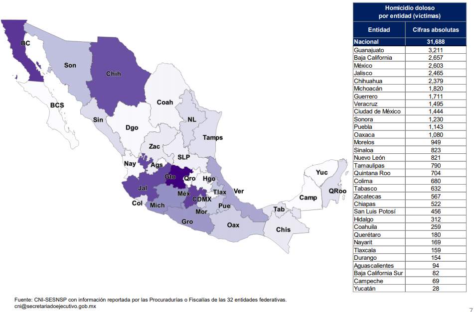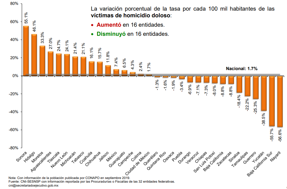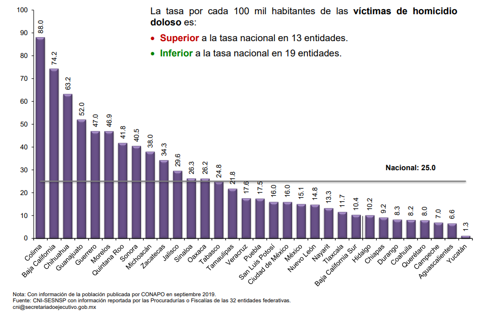 El secretario de Seguridad y Protección Ciudadana, Alfonso Durazo, señaló que Guanajuato es el estado con más víctimas por homicidios dolosos (31 mil 688) y Yucatán es la entidad que menos tiene (28). En la tasa de víctimas por homicidios dolosos, Colima presenta 88.0 y Yucatán 1.3 por cada 100 mil habitantes. Los estados donde se presentó incremento en el número de homicidios son Hidalgo, Morelos, Sonora, Aguascalientes, Tlaxcala, Nuevo León, Tabasco, Coahuila, Chihuahua, Jalisco, México, Guanajuato, Campeche, Colima, Ciudad de México y Querétaro.