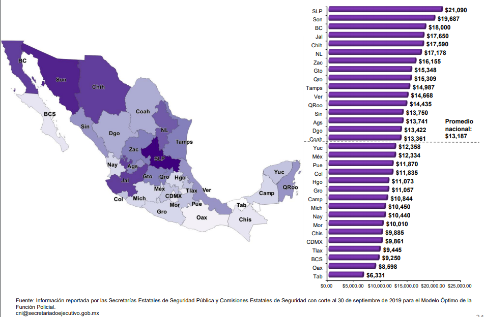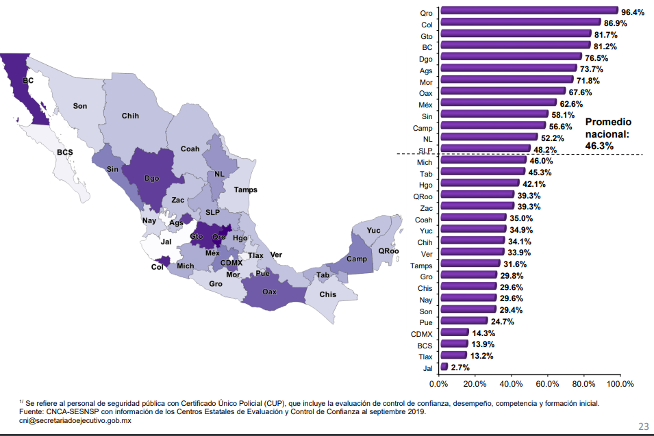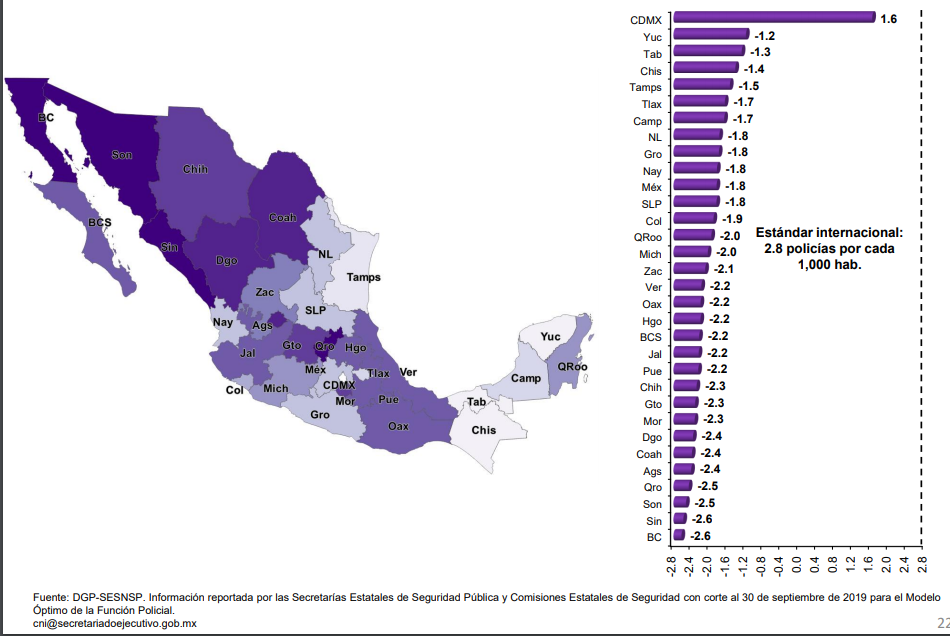 En cuanto a la presencia de policías, la Ciudad de México presenta un déficit mayor en comparación con entidades como Yucatán, Baja California, Sinaloa y Sonora. Precisó que en Querétaro están los policías mejor certificados, mientras que en Jalisco presentan deficiencias; los sueldos para policías son mayores en San Luis Potosí que en Tabasco.