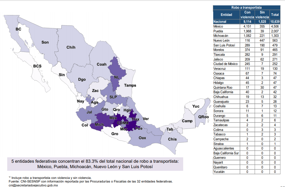 Robo a transportistas por entidad federativa, enero-noviembre 2019
