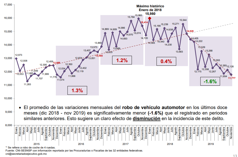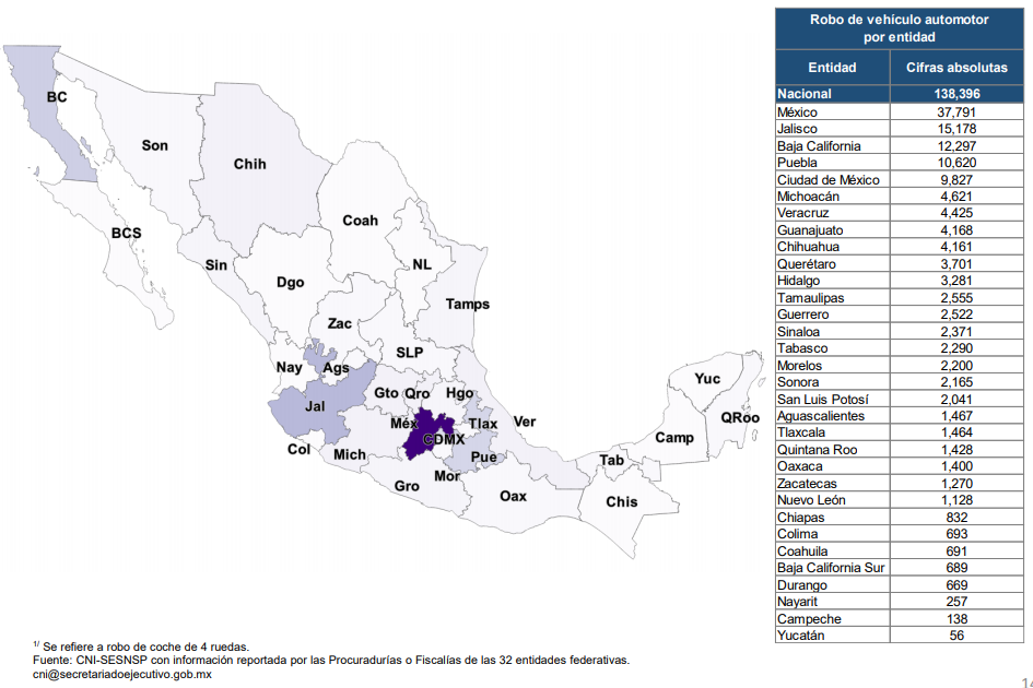 El delito de robo de vehículos fue a la baja, de -1.6 por ciento; aumentó en cuatro estados y disminuyó en 28. El Estado de México, Jalisco y Baja California son los tres estados con mayor incidencia, mientras que Nayarit, Campeche y Yucatán presentan menos de estos ilícitos. El robo a transportistas se redujo en -1.7 por ciento.