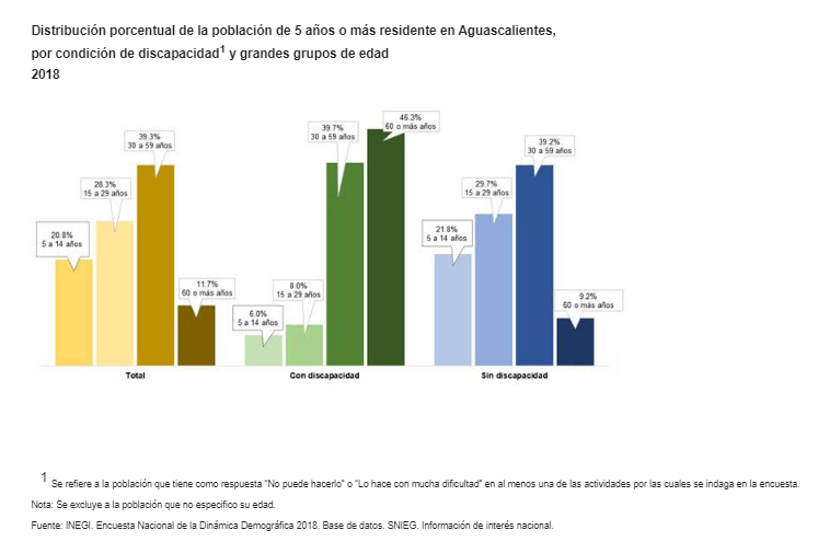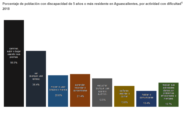 *La prevalencia de la discapacidad de la población de 5 años o más en Aguascalientes es de 6.7% (82 394 personas), de un total de 1,227,968 habitantes que residían en la entidad en 2018.