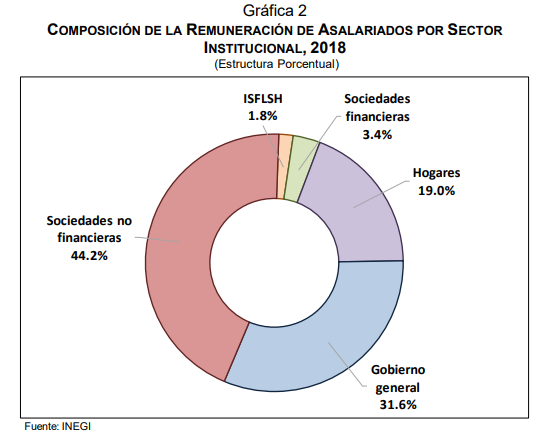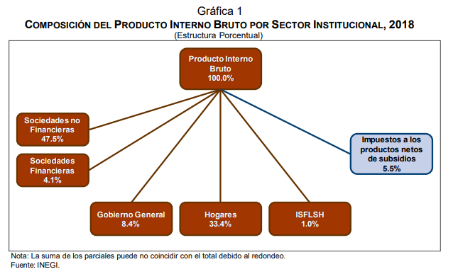 En el 2018, el 47.5% del Producto Interno Bruto en México fue producido por las Sociedades no financieras y los Hogares contribuyeron con el 33.4%; les siguieron el Gobierno general con 8.4%, las Sociedades financieras 4.1% y las Instituciones sin Fines de Lucro que sirven a los Hogares (ISFLSH) con el 1% restante (ver gráfica siguiente).