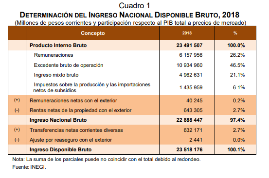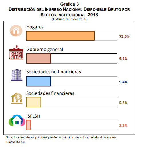 En el 2018, el Ingreso Nacional Disponible Bruto se ubicó en 23,518,176 millones de pesos y la distribución por sector institucional fue la siguiente: los Hogares recibieron el 73.5%, el Gobierno general y las Sociedades no financieras 9.4%, cada una, las Sociedades financieras 5.6% y las ISFLSH 2.2%: