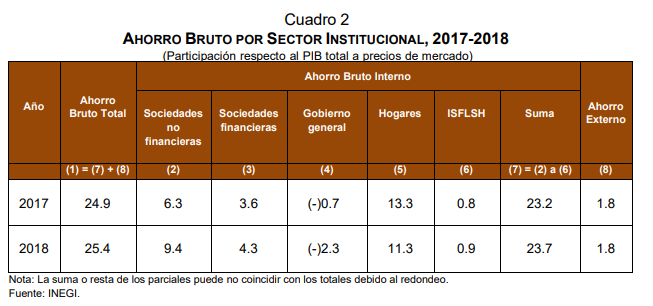 Las Cuentas por Sectores Institucionales muestran que en 2018 un monto relevante del Ahorro Bruto total fue aportado por los Hogares y las Sociedades no financieras con el 44.4% y 37%, respectivamente; le siguieron las Sociedades financieras con 16.9%, y las ISFLSH 3.7%; mientras que el Gobierno observó un desahorro de (-)8.9% y el restante 6.9% fue cubierto con ahorro proveniente del exterior. Así, en el año de referencia la tasa de ahorro bruto total del país fue equivalente al 25.4% del PIB a precios de mercado, cifra mayor en 0.5 puntos porcentuales que la reportada en 2017. Dicho comportamiento derivó de un aumento registrado por la tasa de ahorro interno de 0.5 puntos porcentuales (al pasar de 23.2% en 2017 a 23.7% en 2018); su otro componente, el ahorro externo no presentó cambios en igual lapso.
