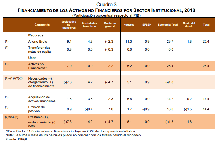 Al consolidarse todos los sectores institucionales se obtienen las fuentes de financiamiento para la inversión total de la economía. De esta manera, la inversión del país representó en 2018 el 25.4% del PIB, y fue financiada por el ahorro interno bruto con una tasa que se ubicó en 23.7% del producto, del cual 11.3% correspondió a los Hogares, 9.4% a las Sociedades no financieras, 4.3% de las Sociedades financieras, 0.9% de las ISFLSH, y el Gobierno general registró un desahorro de (-)2.3%; para cubrir las necesidades de financiamiento el ahorro restante se obtuvo del Resto del mundo con 1.8 por ciento.