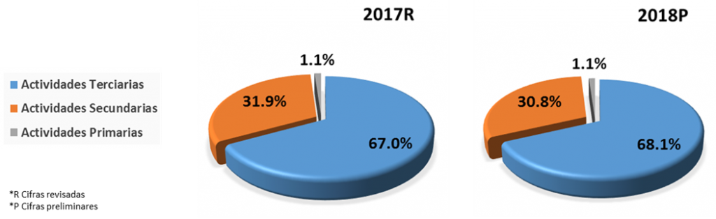 Las adquisiciones y usos de activos en 2018 muestran un incremento con respecto a 2017 en la participación de las actividades terciarias al pasar de 67.0% a 68.1% (servicios comerciales, financieros, educativos, de salud, públicos y privados, y otros servicios), por su parte los usos en actividades secundarias disminuyen en este mismo periodo su participación en 1.1% para situarse en 30.8% (minería, generación de energía eléctrica, construcción y manufacturas), mientras a las actividades primarias les corresponde el 1.1% del total en 2018.