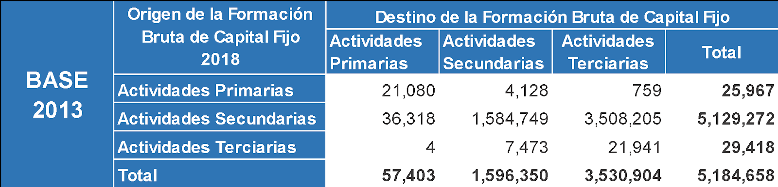 Para 2018, en la estructura de origen y destino de Formación Bruta de Capital Fijo por actividad económica, destaca una concentración en el origen de FBKF de actividades secundarias con 5,129,272 millones de pesos (Construcción, maquinaria y equipo, etc.), mientras que por destino se concentran en actividades terciarias con 3,530,904 millones de pesos.