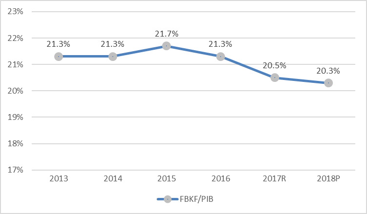 La Formación Bruta de Capital Fijo en 2018 se redujo con respecto a 2017, al pasar de 20.5% a 20.3% como porcentaje del PIB.