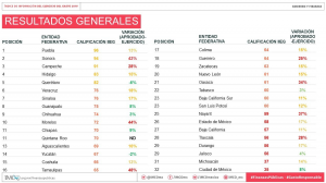 En comparación con la edición anterior, 21 entidades mejoraron, 8 retrocedieron y 3 se mantienen sin cambio. En 2018, la administración pasada de la Ciudad de México destaca por el menor cumplimiento a los formatos establecidos en la normatividad de contabilidad gubernamental: el 60% de los documentos de la Ciudad de México no pueden compararse con otras entidades. Es decir, omite momentos contables o su periodo es ambiguo.