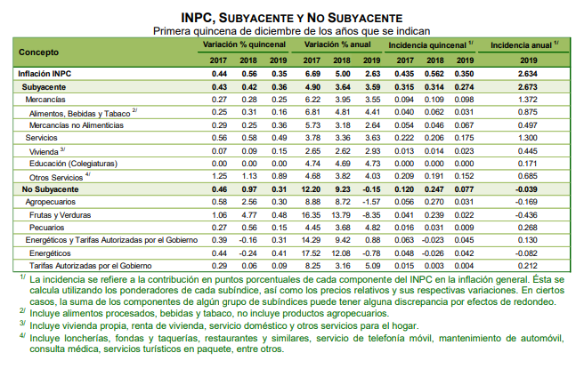 - En la primera quincena de diciembre de 2019, INPC registró además una inflación anual de 2.63 por ciento