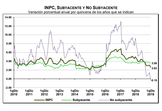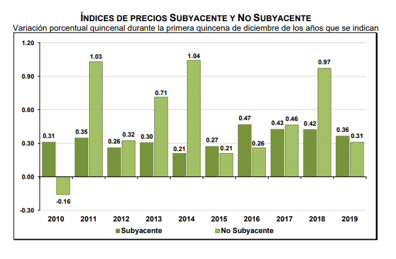 La variación en la primera quincena de diciembre de los índices subyacente y no subyacente fue de 0.36 y de 0.31 por ciento, en ese orden. Los datos comparables para igual quincena de 2018 muestran crecimientos de 0.42 y de 0.97 por ciento.