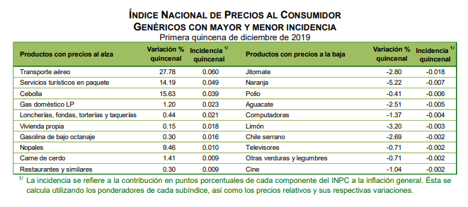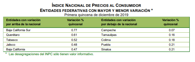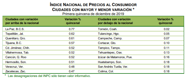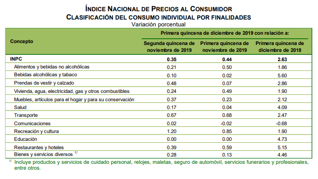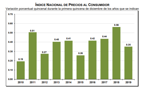 En la primera quincena de diciembre de 2019 el Índice Nacional de Precios al Consumidor (INPC) registró un incremento de 0.35 por ciento respecto a la quincena precedente. Para igual quincena de un año antes reportó un alza de 0.56 por ciento.