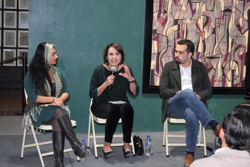 De izquierda a derecha: Karina Leyva (Presentadora), Dahlia de la Cerda (Autora), Tania Magallanes (Jefa de información #LJA), en la presentación del libro “Perras de Reserva” | Foto: Cristian de Lira