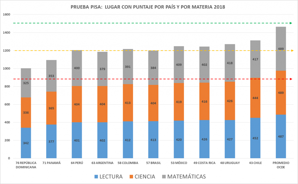 Las tres competencias evaluadas por PISA son: lectura, matemáticas y ciencias. PISA examina el grado de preparación de los jóvenes para la vida adulta y, hasta cierto punto, la efectividad de los sistemas educativos. Evaluó a 600 mil estudiantes de 15 años en 79 países en 2018.