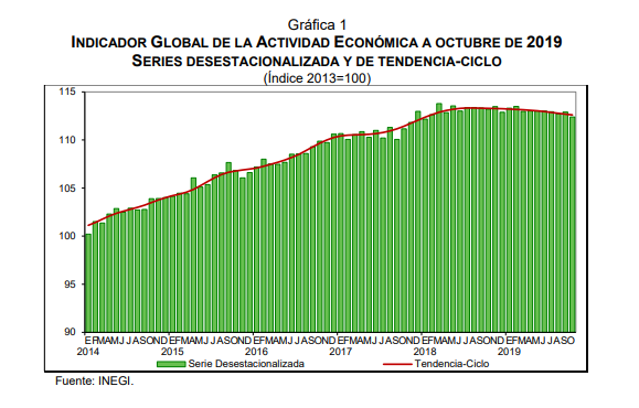 El Inegi informó que el Indicador Global de la Actividad Económica (IGAE) disminuyó (-)0.5% en términos reales en el décimo mes del presente año respecto al mes previo, con cifras desestacionalizadas.