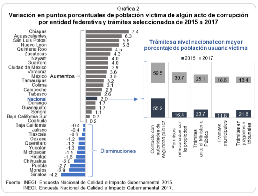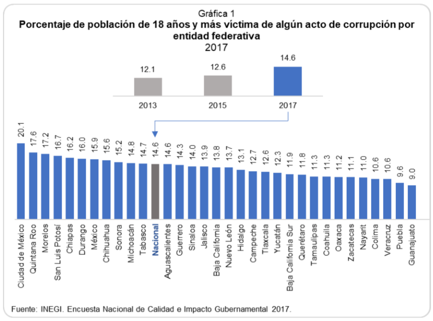 Durante 2017, 14.6% de la población de 18 años y más que tuvo contacto con algún servidor público sufrió algún acto de corrupción, siendo la Ciudad de México la de mayor porcentaje de víctimas con 20.1%, seguida de Quintana Roo con 17.6% y Morelos con 17.2%. Por el contrario, Guanajuato, Puebla, Veracruz y Colima fueron las entidades con las menores prevalencias de corrupción (Gráfica 1).
