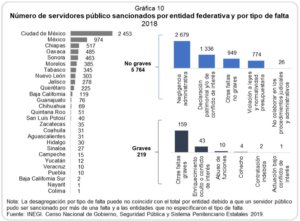 Las entidades en las que se sancionaron servidores por faltas graves fueron: estado de México (505 servidores), Baja California (119), Ciudad de México (110), Oaxaca (47), Sonora (43), Tabasco (10), Jalisco (3) y Baja California Sur (1).