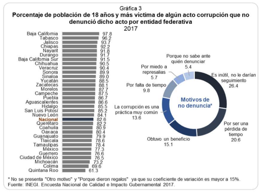 Los principales motivos de la población para no denunciar los actos de corrupción se relacionan con la falta de confianza en las autoridades para atender el caso. Dos datos que sobresalen es que casi tres de cada 10 víctimas de corrupción no denunciaron por que obtuvieron algún beneficio o bien, porque consideraron que la corrupción es una práctica común. En Aguascalientes, el 88.6% de las víctimas de corrupción en 2017 no denunciaron.