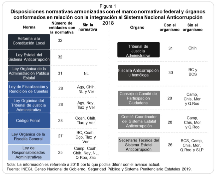 Los datos anteriores ilustran el progreso al 2018 en las entidades federativas para la conformación del Sistema Nacional Anticorrupción. Este proceso es continuo y aún en estos días se continúa con los ajustes y la construcción institucional, a fin de contar con los mecanismos de coordinación entre órgano de gobierno en materia de prevención, detección y sanción de faltas administrativas y hechos de corrupción.