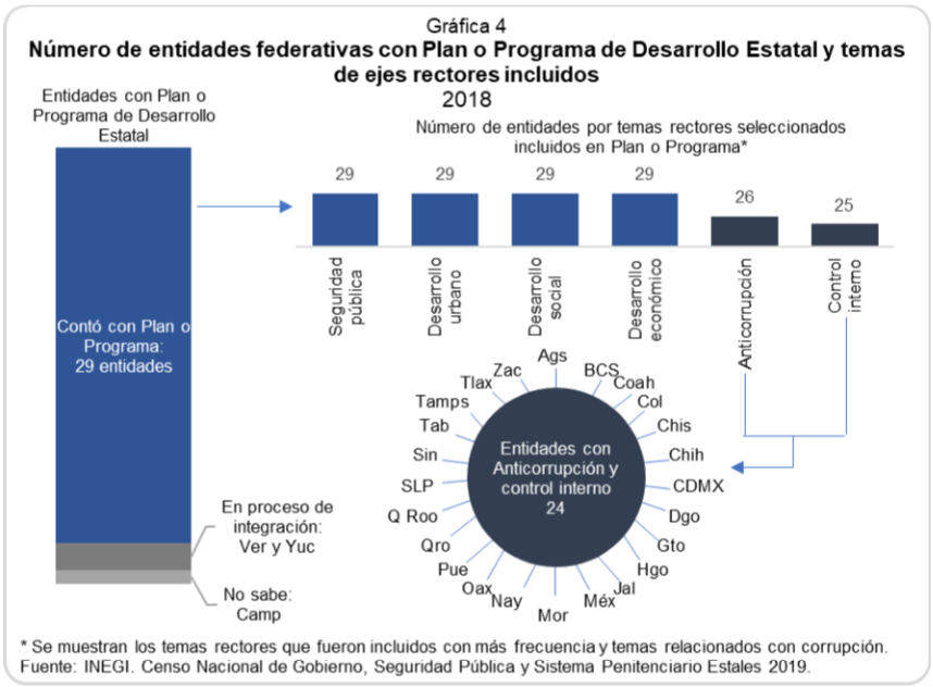 Parte de las atribuciones del SNA es el diseño e implementación de la política pública en la materia en el ámbito nacional, la cual debe delinear las estrategias y acciones para la prevención, control y sanción de la corrupción. Al indagar sobre la consideración estratégica de la lucha contra la corrupción dentro del Plan o Programa de Desarrollo Estatal (PDE), se encontró que de las 29 entidades que en 2018 contaron con un PDE, 24 indicaron que la anticorrupción y el control interno de la administración pública eran ejes rectores, mientras que en tres más se incluyeron uno de los dos temas como eje rector de sus instrumentos programáticos (Gráfica 4).