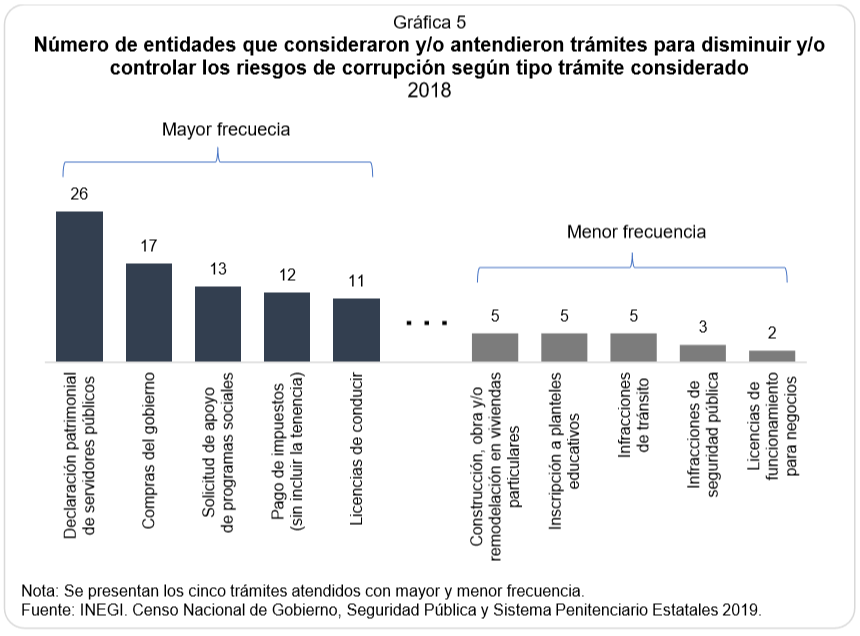 Además de la existencia de un Plan o programa anticorrupción, las administraciones públicas realizan acciones para controlar riesgos y/o actos de corrupción en ciertos trámites en específico. Las áreas donde las entidades han puesto mayor atención para la prevención de la corrupción son: la declaración patrimonial, las áreas de compras de gobierno y las áreas donde se canalizan las solicitudes de apoyo de programas sociales. Cabe mencionar que sólo seis entidades (Chiapas, Jalisco, Querétaro, Tamaulipas, Tlaxcala y Zacatecas) contemplan las infracciones de tránsito o de seguridad pública como parte de las áreas de control, aun cuando es en la interacción de los ciudadanos con las autoridades de seguridad pública en donde se observa la mayor prevalencia de corrupción, que de acuerdo con la Encuesta Nacional de Calidad e Impacto Gubernamental fue 59.5% en 2017 (Gráfica 5).