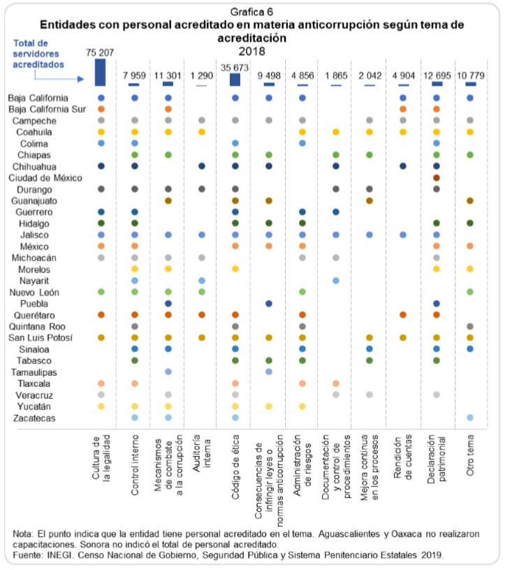 Durante 2018, 30 entidades realizaron capacitaciones en materia de anticorrupción y en el ámbito nacional se acreditaron 178 069 servidores públicos en materia anticorrupción. Los temas de cultura de la legalidad y código de ética los que concentran más servidores públicos acreditados, con 62.3% del total de servidores públicos que recibieron algún curso de capacitación en la materia.