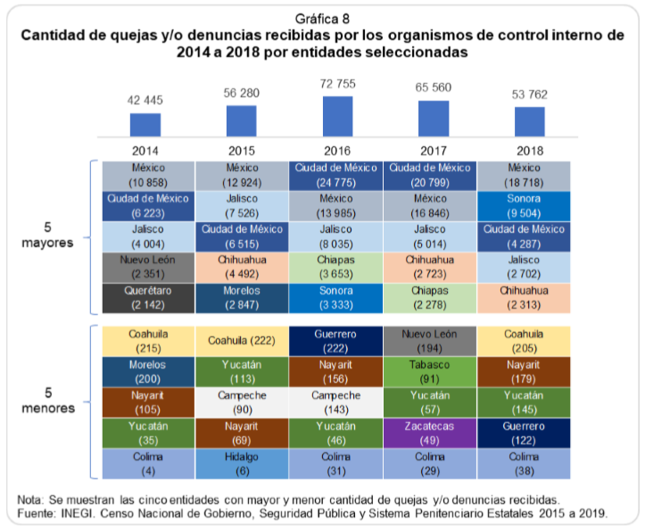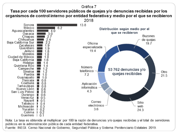 - Aguascalientes presentó en 2018 una tasa de cuatro denuncias o quejas recibidas por los órganos internos de control por cada 100 servidores públicos