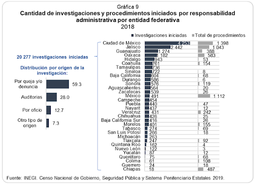 Durante 2018, en la Ciudad de México se iniciaron la mayor cantidad de procedimientos por responsabilidad administrativa con 22.0% del total nacional, seguida del estado de México con 17.4% y Jalisco con 16.4%. La menor cantidad se iniciaron en Nuevo León, Quintana Roo, Durango y Sinaloa con menos de 10 procedimientos y en Campeche, Michoacán y Tamaulipas no se iniciaron procedimientos de responsabilidad administrativa.