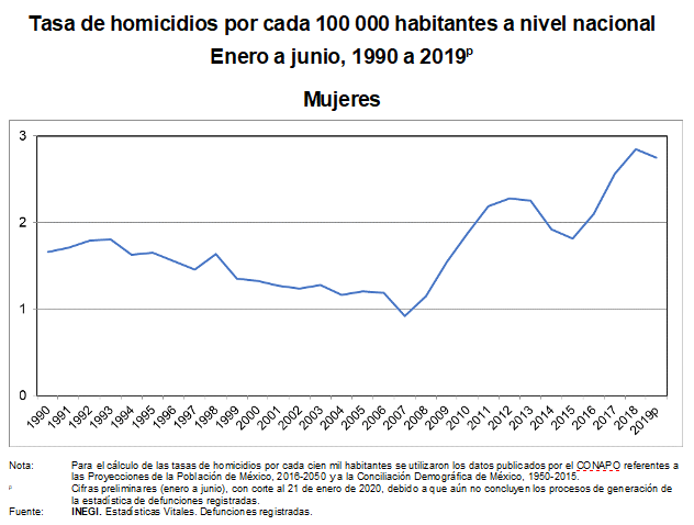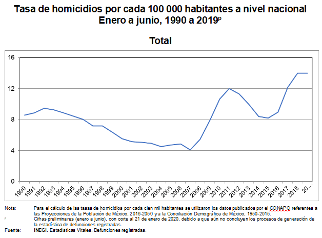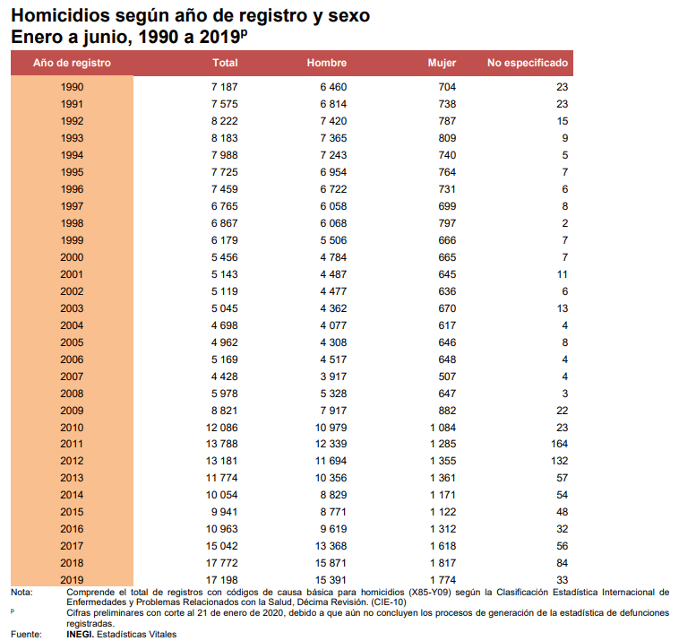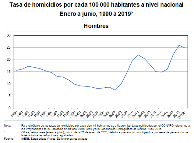 Las estadísticas revelan que en el primer semestre de 2019 se registraron 17,198 homicidios en México. Es decir, una razón de 14 homicidios por cada 100 mil habitantes en el ámbito nacional, tasa que es igual a la registrada en 2018 para el mismo periodo. Con la finalidad de facilitar su comparación con la información de años anteriores se agrega la serie histórica de la estadística definitiva de presuntos homicidios de 1990 a 2018.