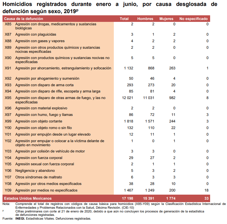 Para identificar los homicidios es necesario que la información registrada en los certificados de defunción corresponda a una causa básica de la defunción en el rango de códigos X85-Y09 de la CIE-10. El Inegi publicará en julio de 2020 la información preliminar anual y en octubre del mismo año, la estadística definitiva de defunciones registradas por homicidio, una vez que los procesos requeridos para ello hayan concluido. En este sentido, la estadística preliminar semestral debe observarse como un registro sujeto a modificaciones tanto en su versión preliminar anual como en la versión definitiva anual, y debe utilizarse bajo esta consideración.